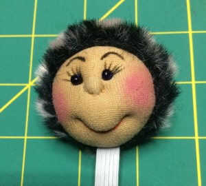 Next sew on a length of elastic to the back of the head. Now embellish the head with hair and give the face some character. I have used real blusher & permanent fabric pens to draw in the eye lashes, brows & lips.